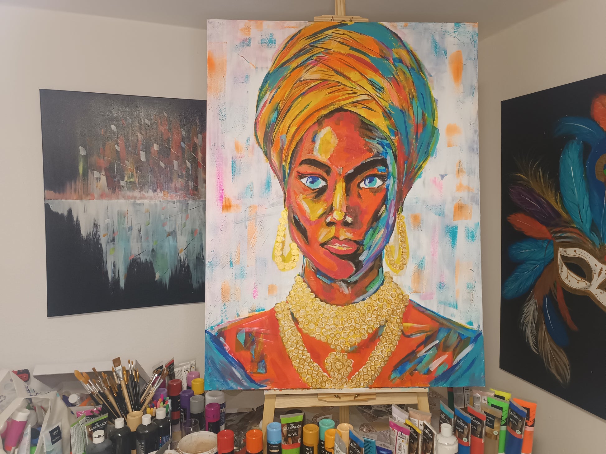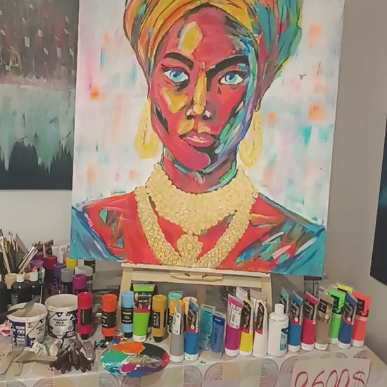 “The Golden Sovereign” is a large-scale original acrylic painting on canvas (120 x 90 x 1.5 cm) portraying a powerful feminine figure crowned in vibrant color and layered gold.